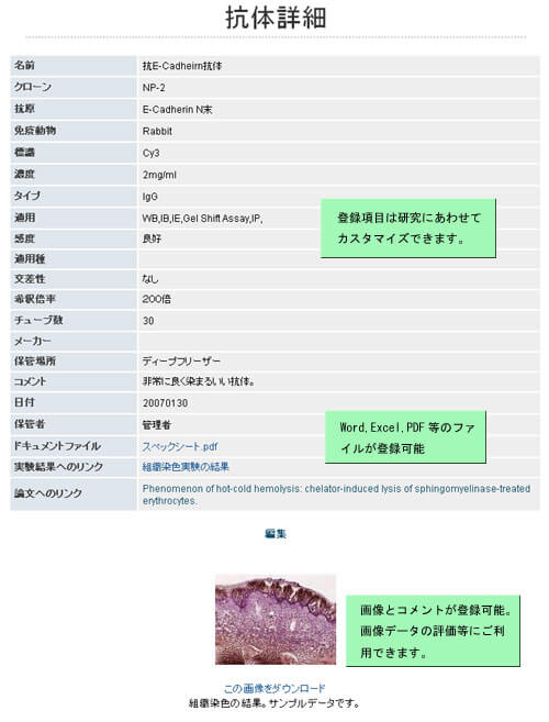 抗体のスペックシートを登録したり、抗体を用いたWestern blotなどの実験結果を登録しておくことも可能です。研究室で作成した抗体はもちろん、市販されている抗体を購入された場合でもご利用になれます。