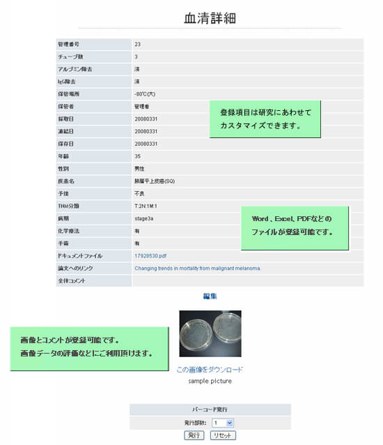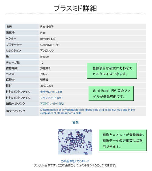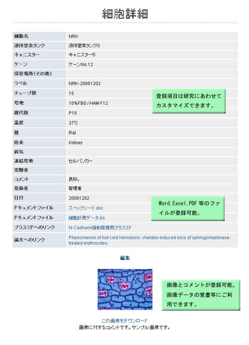 例えば、液体窒素タンク内での保管位置や、培養条件、培地、状態等を管理できます。スペックシートを登録したり、形態や実験データをあわせて登録しておくことも可能です。