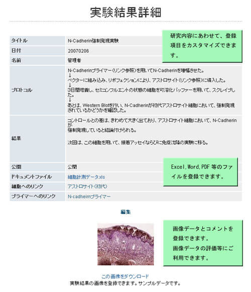 画像や画像1枚1枚に対するコメント、Excel、Word、PDFといったファイルも同時に登録できるので、「実験結果で得られた顕微鏡の画像」や「Excelを用いて解析を行った結果」、「Wordを用いて作成した結果報告レポート」などを登録しておくことが可能になります。