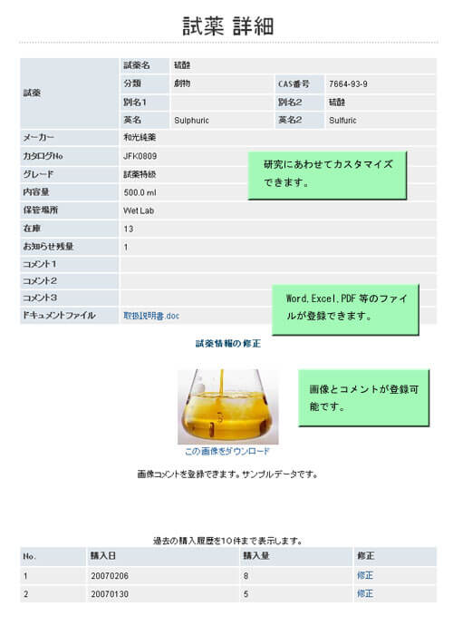毒物・劇物・PRTRの対象となっている化学物質や試薬が1000種類以上、予めデータベースに登録してあります。 試薬の日本語名や英語名、CAS番号などから検索することができ、研究室でこれらの試薬の使用量や在庫管理が簡単に行えるようになります。