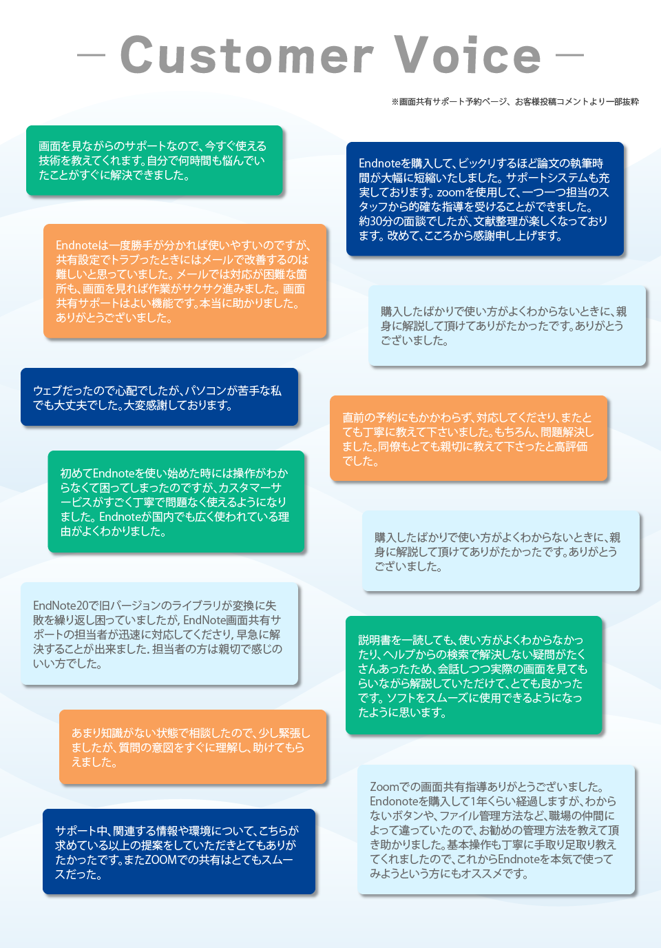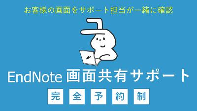 こんな使い方ができないかなとお考えのとき予期せぬトラブルが発生したとき、ユサコがご案内します。パソコン同士の画面をつなぐ「EndNote画面共有サポート」ではメールでは分かりにくい内容も容易に確認することができます。