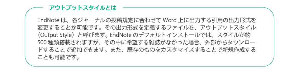 ユサコのユーザー登録がお済みの方は、EndNoteで用意されているアウトプットスタイル7,000点以上に加え、ユサコが皆さまの要望に合わせて作成したアウトプットスタイル2,000点以上を無料でご利用いただけます。