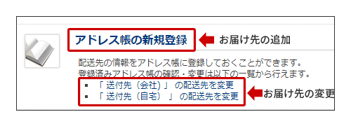 (2)登録済みのお届け先の変更をする場合は「アドレス帳の新規登録」の下に表示される「配送先を変更」のリンクからお届け先情報の変更ができます。
