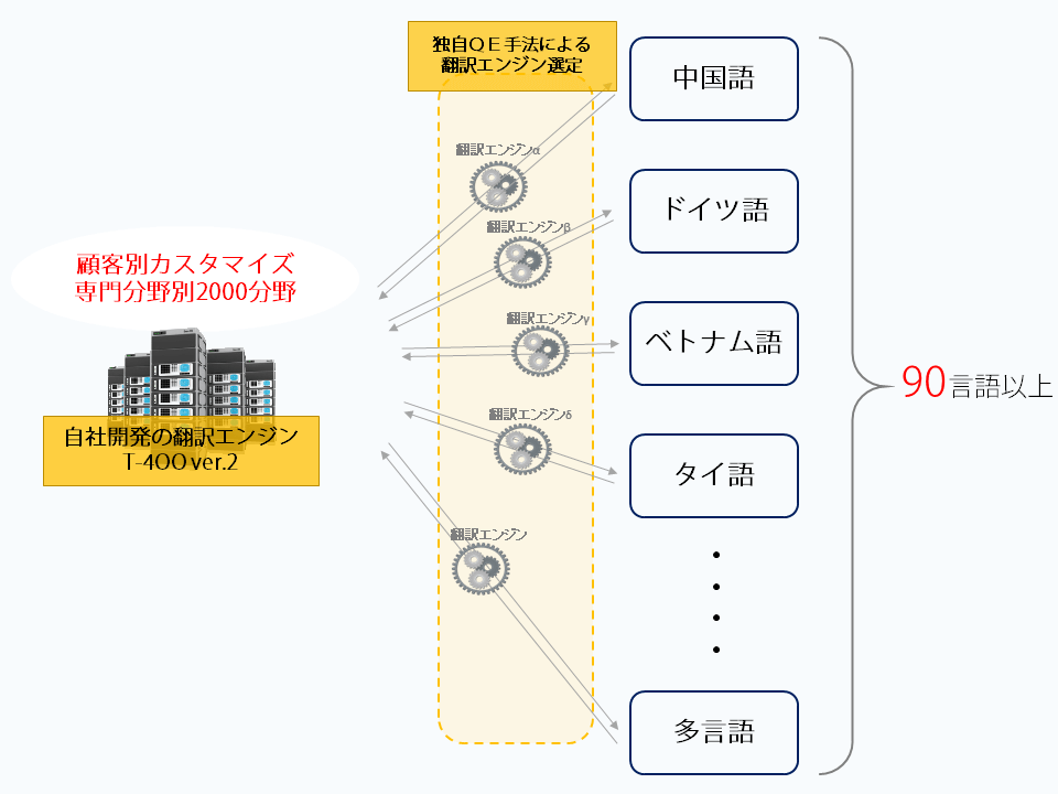 T-4OO(ティー・フォー・オー・オー)は2,000の分野からなる専門分野データベースと、ユーザーごとの御社専用データベースを兼ね備えた、最新のAI自動翻訳です。