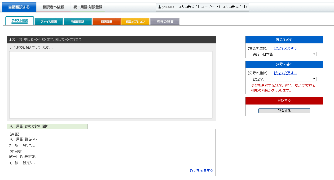 あらかじめ分野を選択して自動翻訳することで、その分野に適切な訳文が得られます。分野は2,000分野から選択可能です。