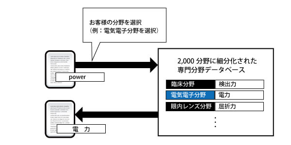 専門分野データベースは、医療・医薬・化学・機械・IT・法務・特許・知財、金融、政治・経済・社会など2,000分野の膨大な専門用語を蓄積しており、各分野に合わせた適訳を自動翻訳に反映します。